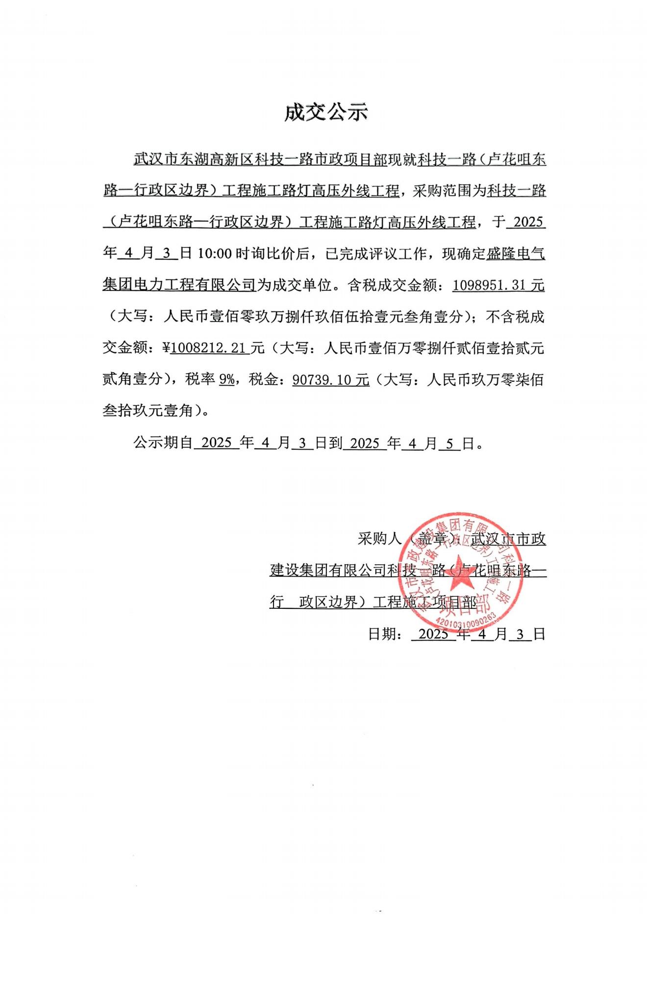 科技一路(盧花咀東路—行政區(qū)邊界)工程施工路燈高壓外線工程成交公示