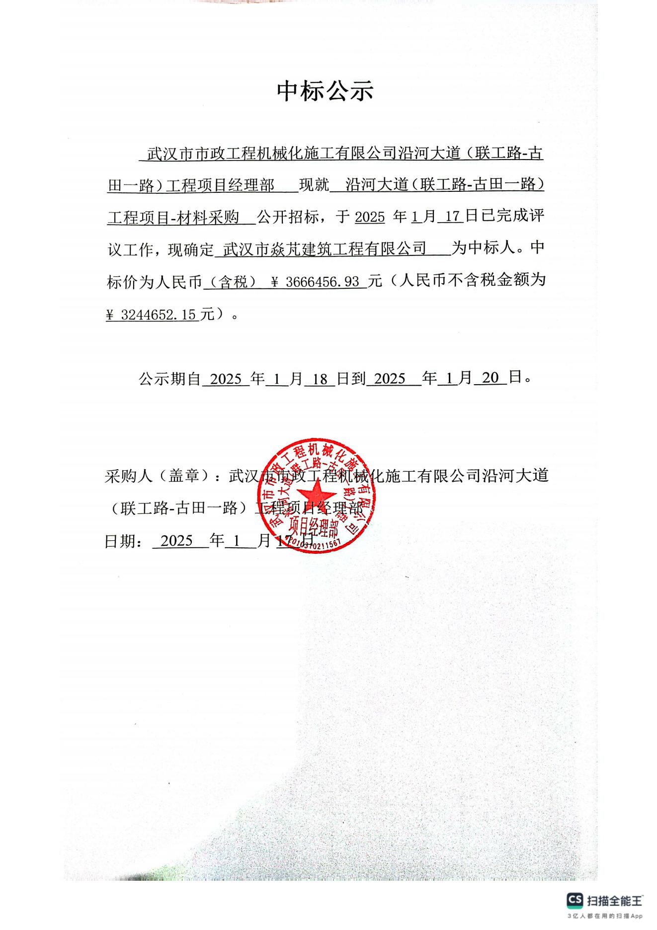 沿河大道(聯(lián)工路-古田一路)工程-材料采購中標公示