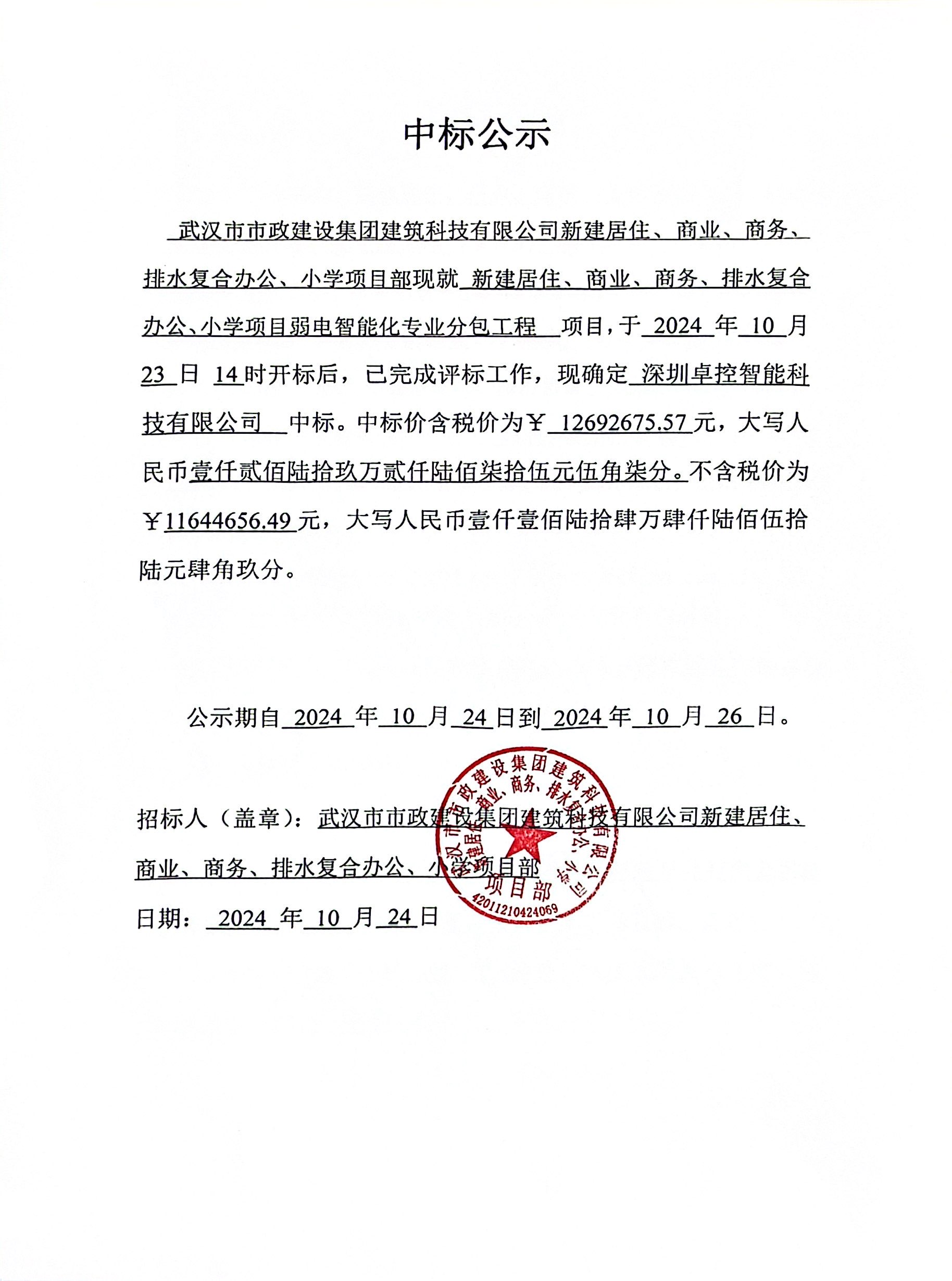武漢市市政建設(shè)集團(tuán)建筑科技有限公司新建居住、商業(yè)、商務(wù)、排水復(fù)合辦公、小學(xué)項(xiàng)目弱電智能化專(zhuān)業(yè)分包工程中標(biāo)公示