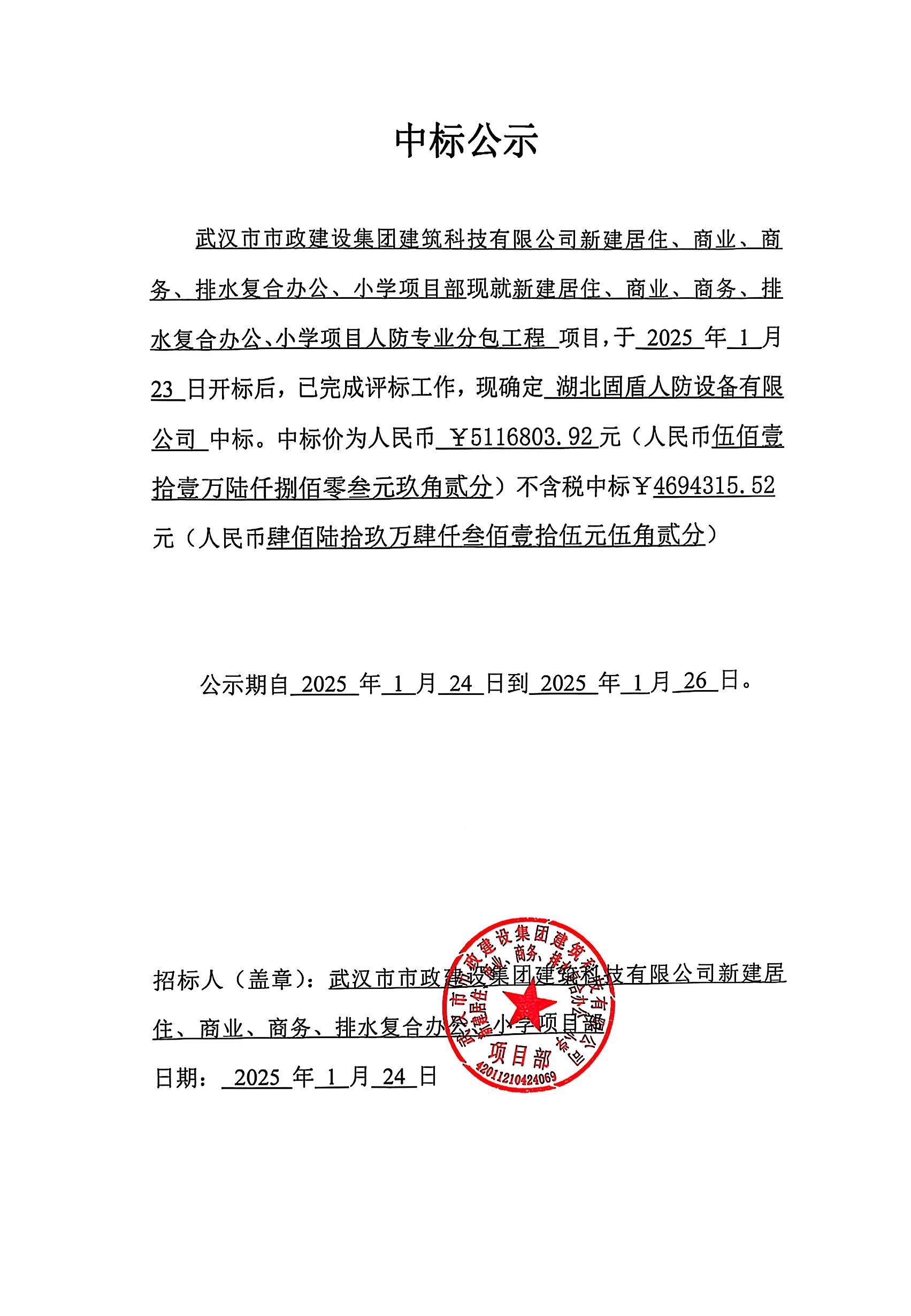 武漢市市政建設(shè)集團(tuán)建筑科技有限公司新建居住、商業(yè)、商務(wù)、排水復(fù)合辦公、小學(xué)項(xiàng)目人防專業(yè)分包工程 中標(biāo)公示