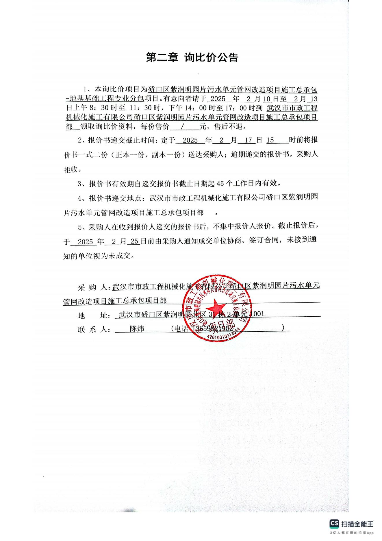 硚口區(qū)紫潤明園片污水單元管網(wǎng)改造項(xiàng)目施工總承包-地基基礎(chǔ)工程專業(yè)分包詢價公告