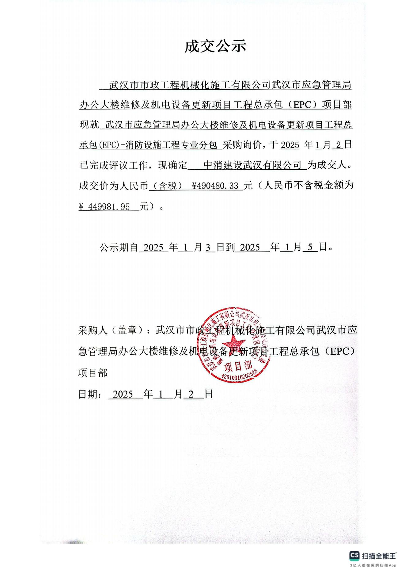 武漢市應急管理局辦公大樓維修及機電設備更新項目工程總承包(EPC)-消防設施工程專業(yè)分包成交公示