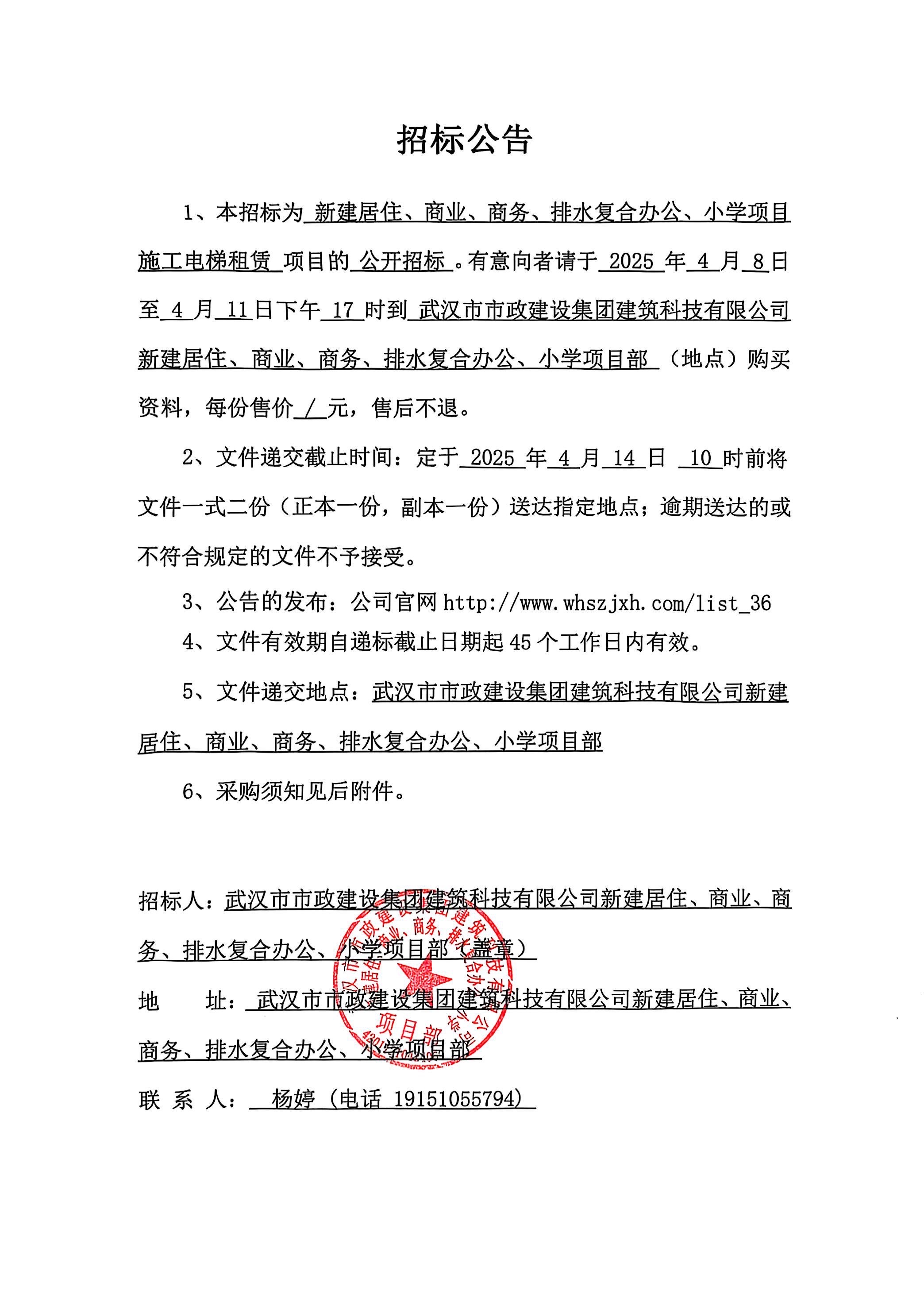 武漢市市政建設(shè)集團(tuán)建筑科技有限公司新建居住、商業(yè)、商務(wù)、排水復(fù)合辦公、小學(xué)項(xiàng)目施工電梯租賃招標(biāo)公告