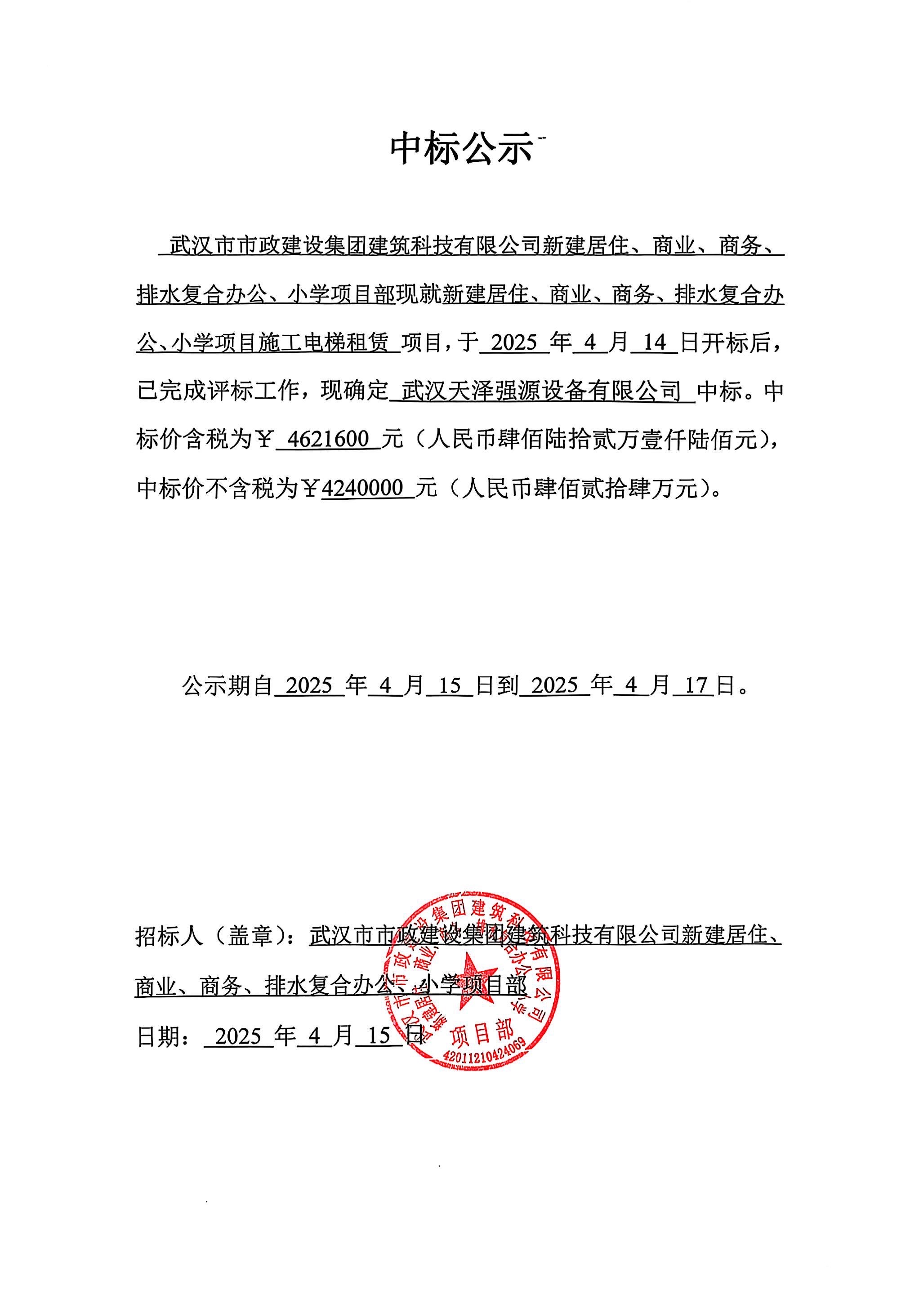武漢市市政建設(shè)集團建筑科技有限公司新建居住、商業(yè)、商務(wù)、排水復(fù)合辦公、小學(xué)項目施工電梯租賃中標(biāo)公示
