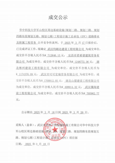 華中科技大學(xué)軍山校區(qū)周邊基礎(chǔ)設(shè)施(規(guī)劃二路、規(guī)劃三路、規(guī)劃四路東段規(guī)劃五路、規(guī)劃七路)工程設(shè)計(jì)施工總承包(EPC)道路排水及附屬工程勞務(wù)成交公示