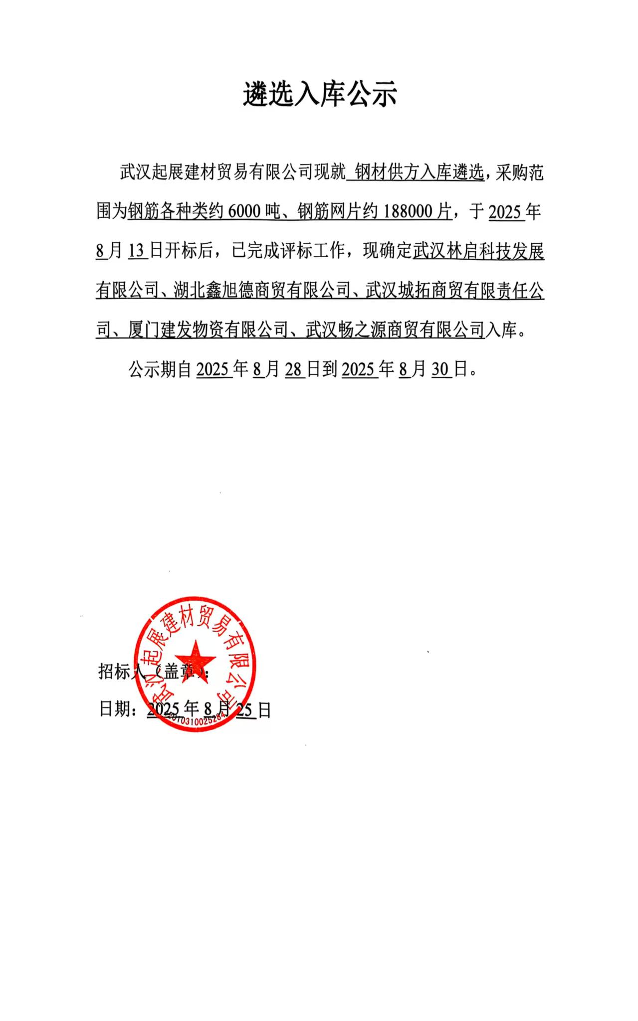 武漢起展建材貿(mào)易有限公司鋼材供方遴選入庫(kù)公示