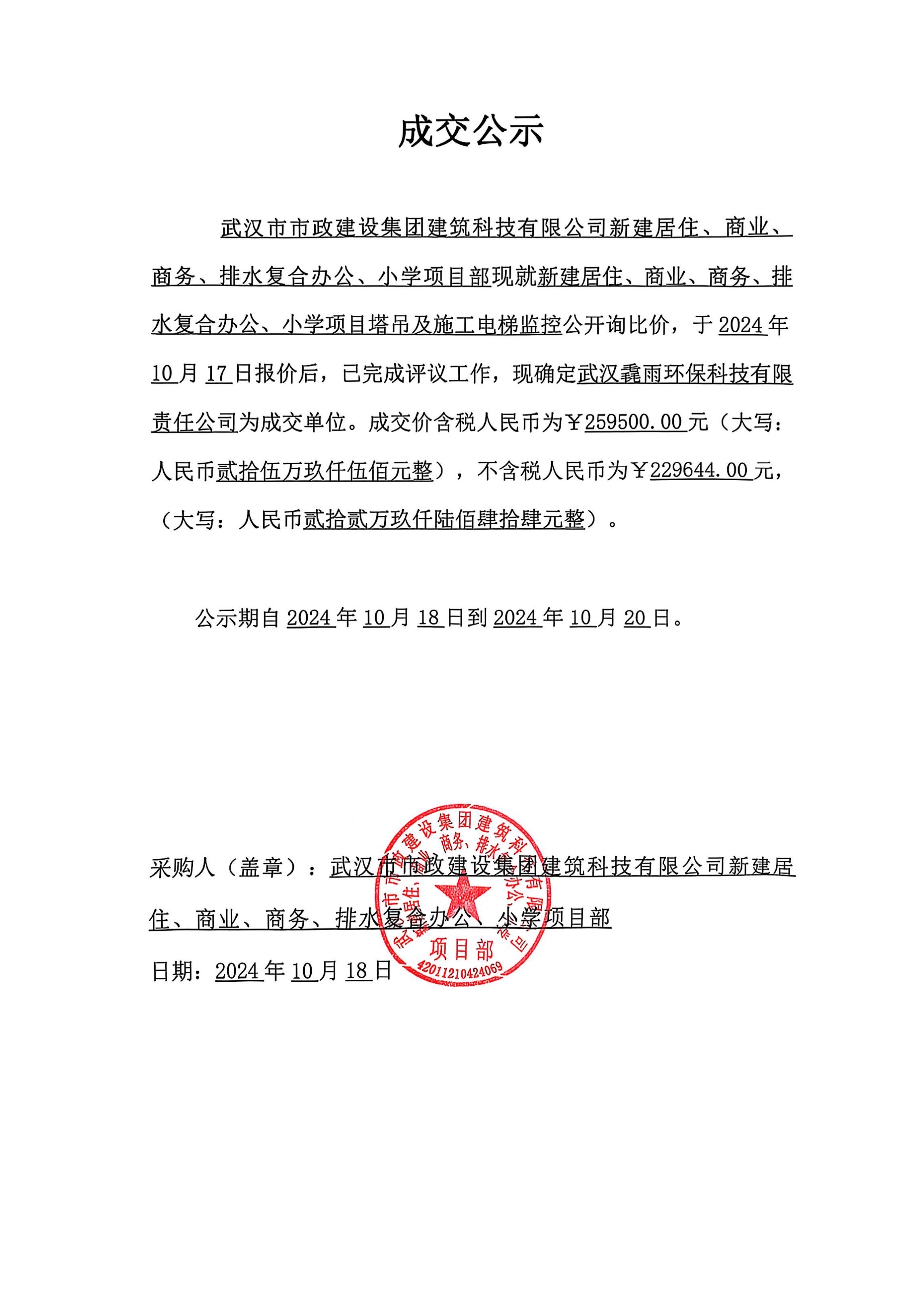 武漢市市政建設(shè)集團(tuán)建筑科技有限公司新建居住、商業(yè)、商務(wù)、排水復(fù)合辦公、小學(xué)項(xiàng)目塔吊及施工電梯監(jiān)控成交公示