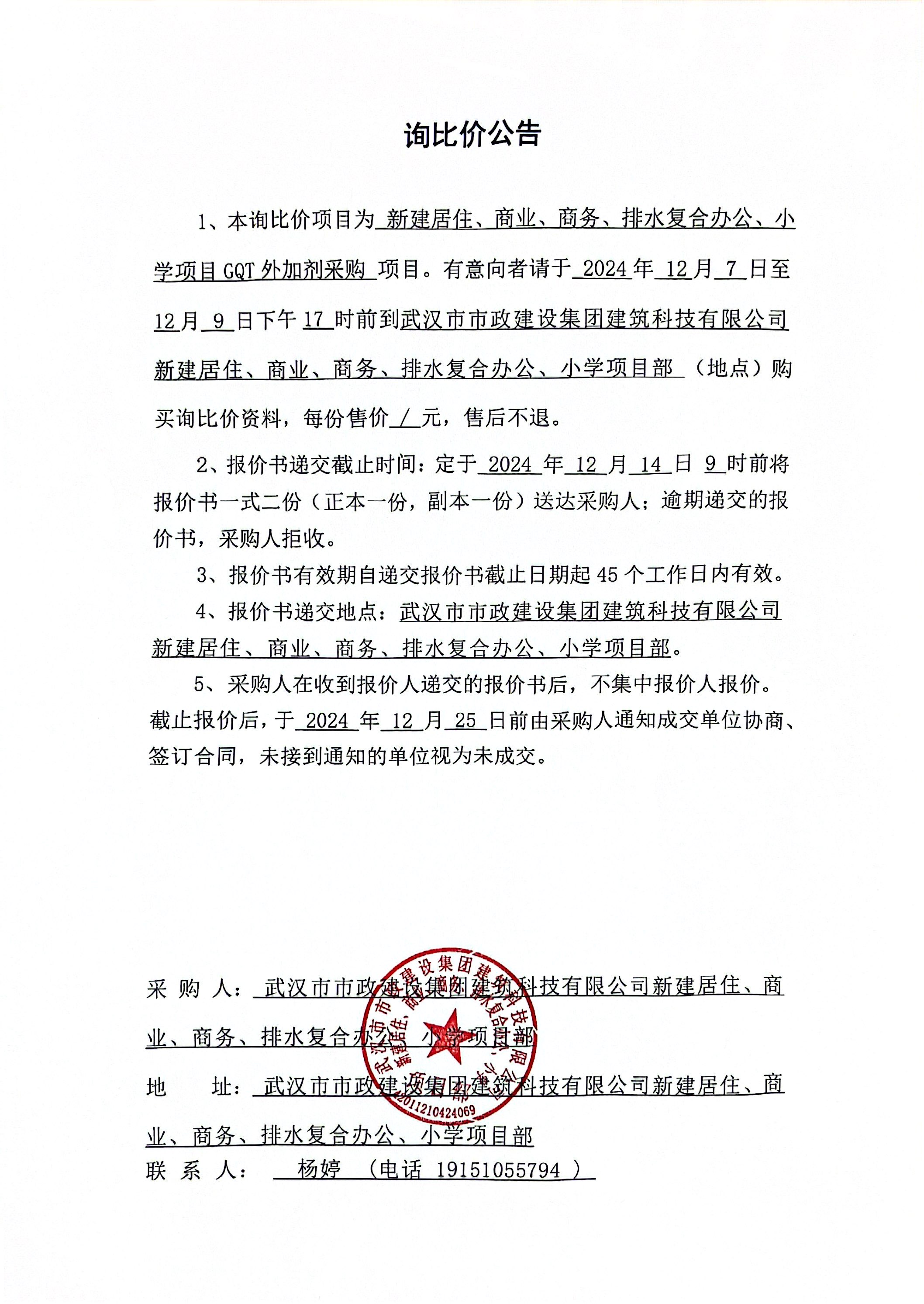 武漢市市政建設(shè)集團(tuán)建筑科技有限公司新建居住、商業(yè)、商務(wù)、排水復(fù)合辦公、小學(xué)項(xiàng)目GQT外加劑采購詢價(jià)公告