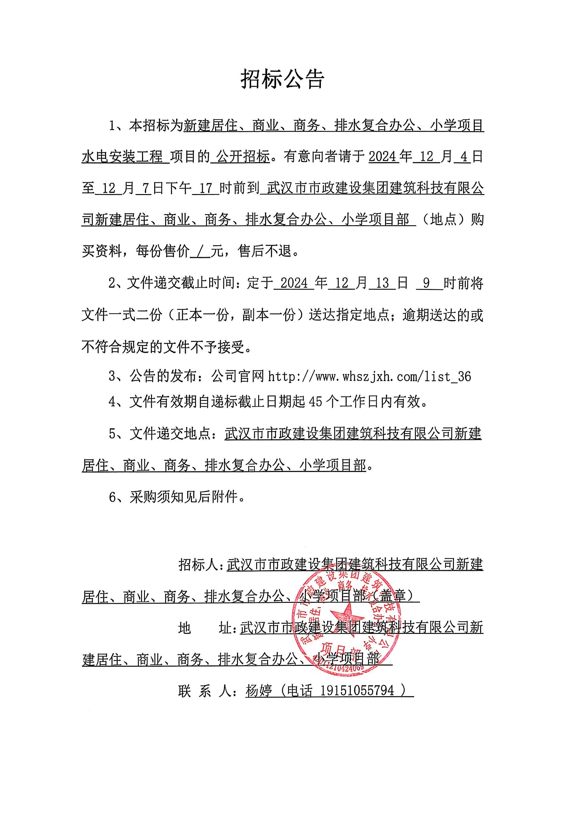 武漢市市政建設(shè)集團建筑科技有限公司新建居住、商業(yè)、商務(wù)、排水復(fù)合辦公、小學(xué)項目水電安裝工程招標公告