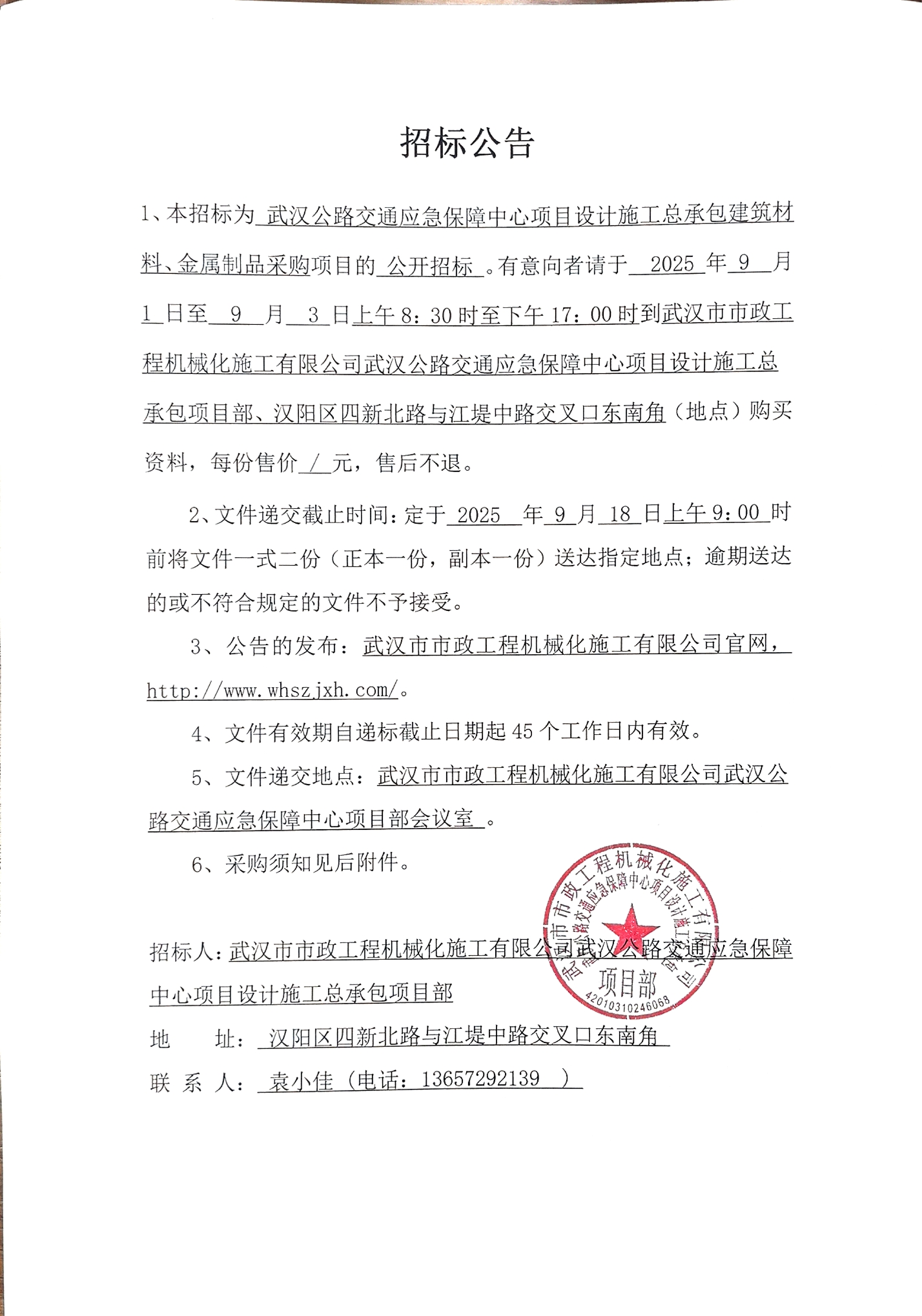 武漢公路交通應(yīng)急保障中心項目設(shè)計施工總承包建筑材料、金屬制品采購招標公告
