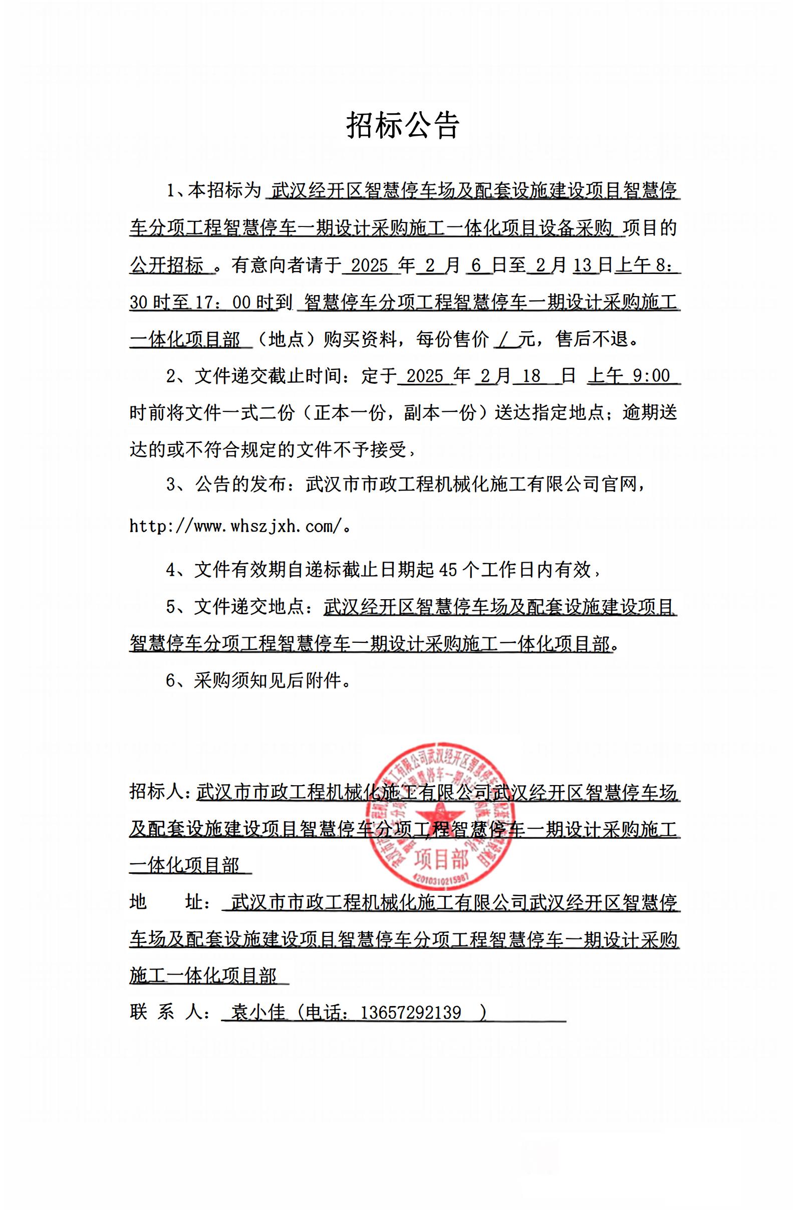 武漢經(jīng)開區(qū)智慧停車場及配套設(shè)施建設(shè)項目智慧停車分項工程智慧停車一期設(shè)計采購施工一體化項目 設(shè)備采購招標公告