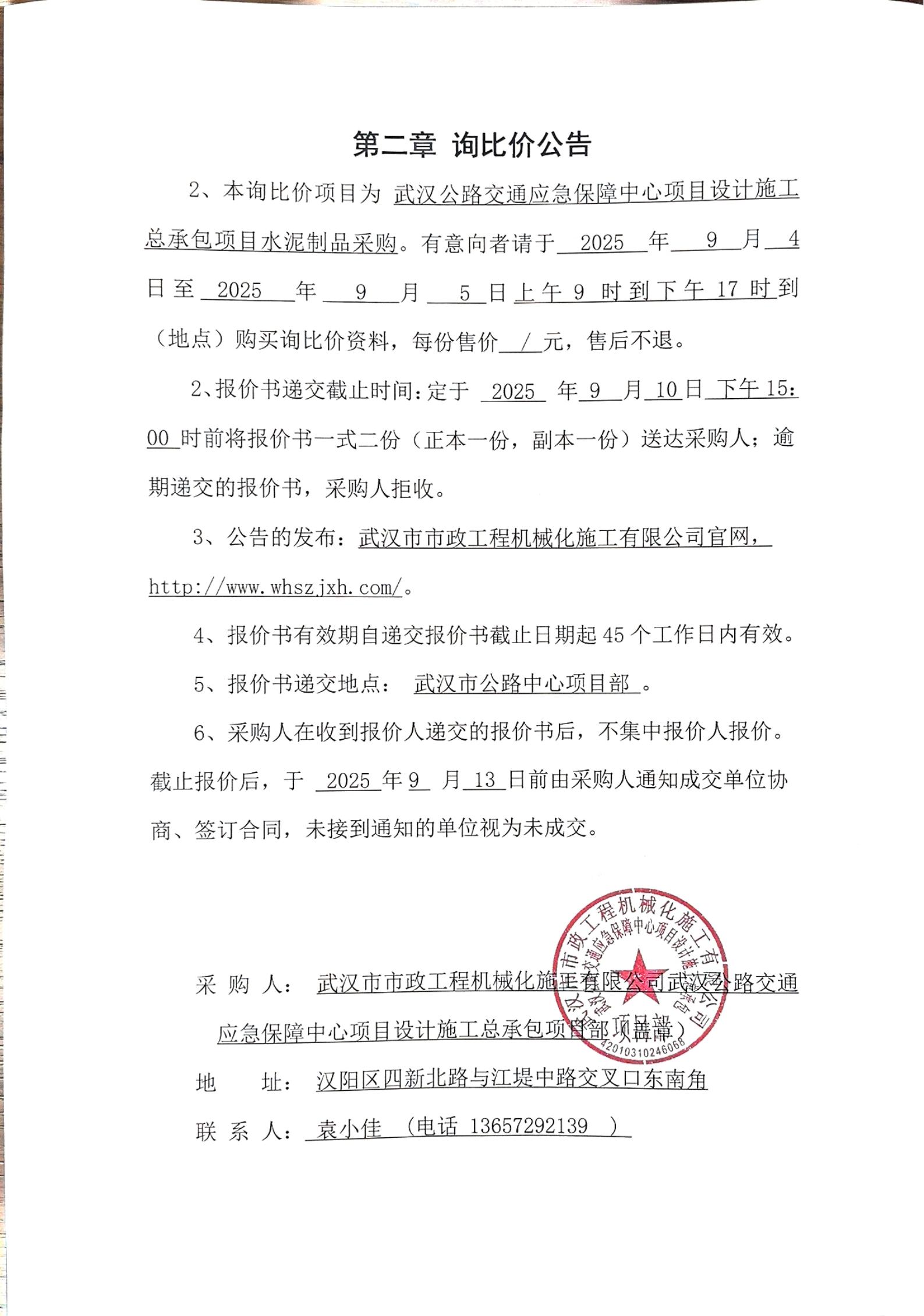 武漢公路交通應(yīng)急保障中心項(xiàng)目設(shè)計(jì)施工總承包項(xiàng)目水泥制品采購詢價(jià)公告