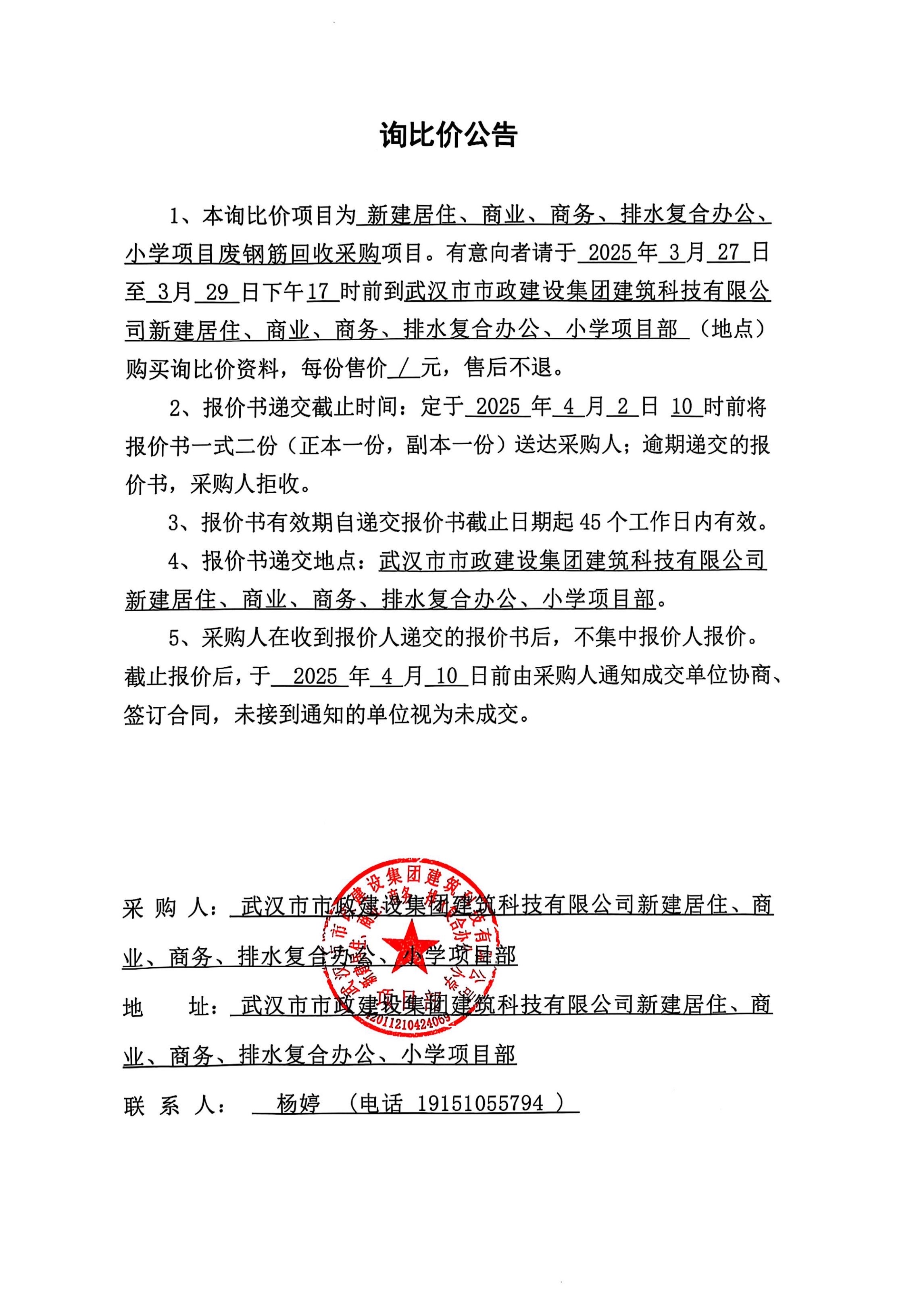 武漢市市政建設(shè)集團(tuán)建筑科技有限公司新建居住、商業(yè)、商務(wù)、排水復(fù)合辦公、小學(xué)項(xiàng)目廢鋼筋回收采購(gòu)詢(xún)價(jià)公告