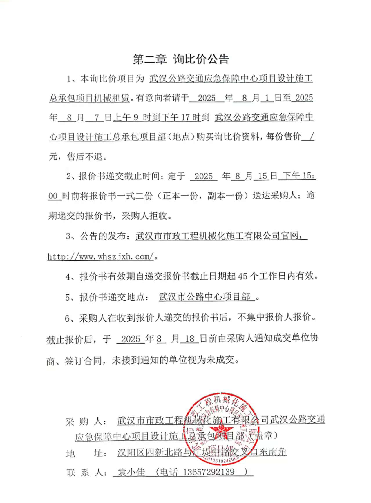 武漢公路交通應(yīng)急保障中心項(xiàng)目設(shè)計(jì)施工總承包項(xiàng)目機(jī)械租賃詢價(jià)公告