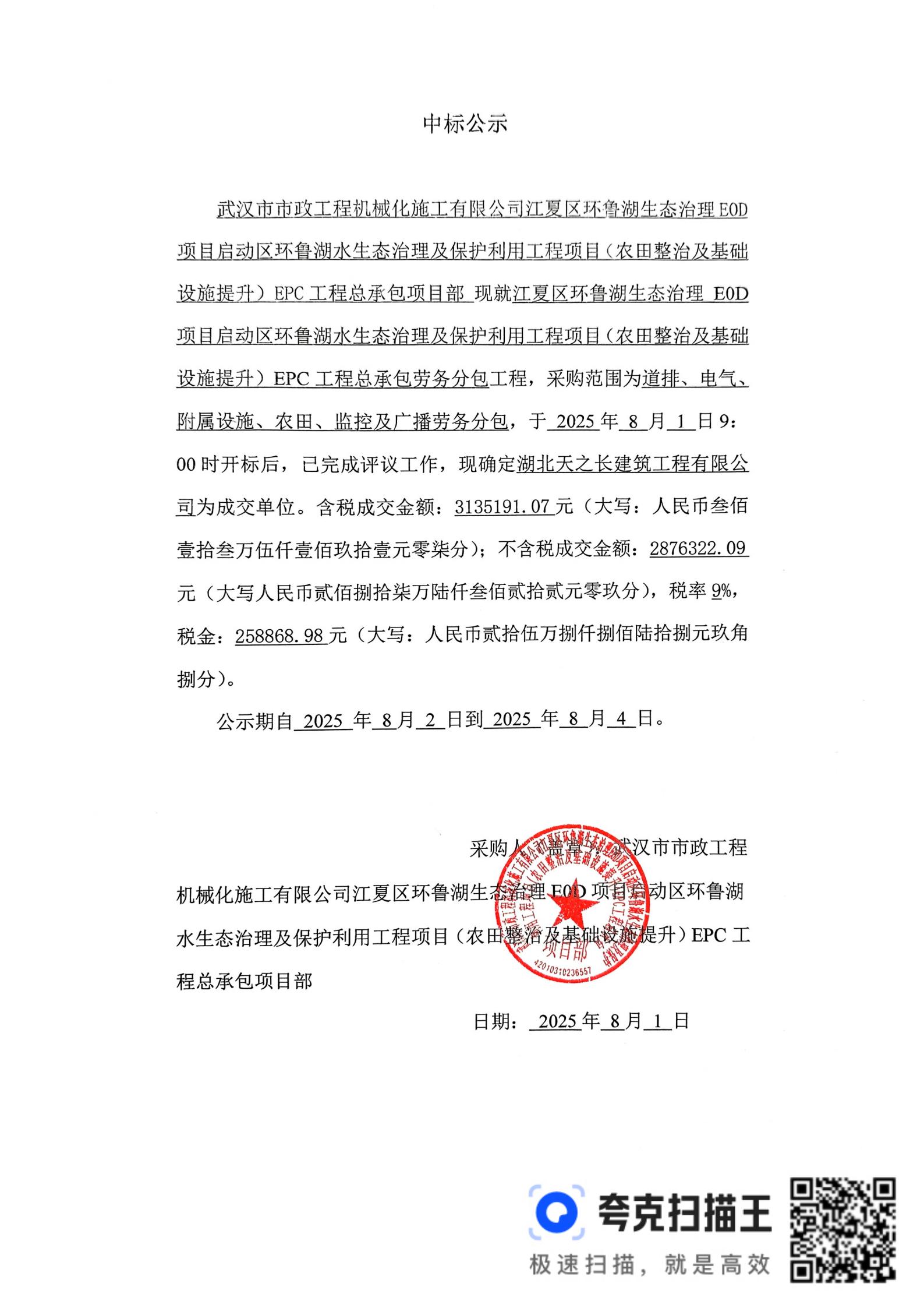 江夏區(qū)環(huán)魯湖生態(tài)治理 E0D 項目啟動區(qū)環(huán)魯湖水生態(tài)治理及保護(hù)利用工程項目(農(nóng)田整治及基礎(chǔ)設(shè)施提升)EPC工程總承包勞務(wù)分包中標(biāo)公示