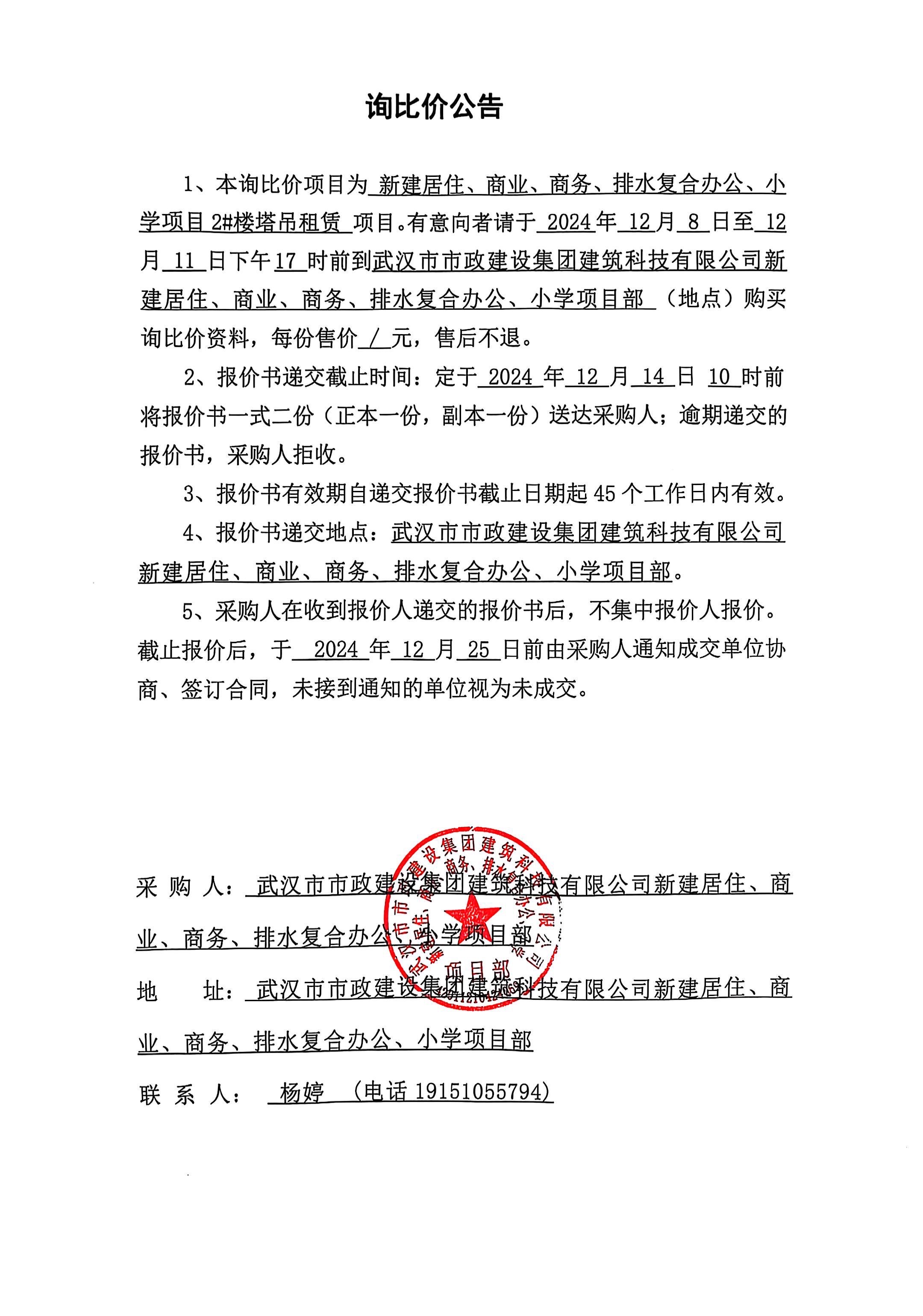 武漢市市政建設(shè)集團(tuán)建筑科技有限公司新建居住、商業(yè)、商務(wù)、排水復(fù)合辦公、小學(xué)項(xiàng)目2#樓塔吊租賃詢價(jià)公告