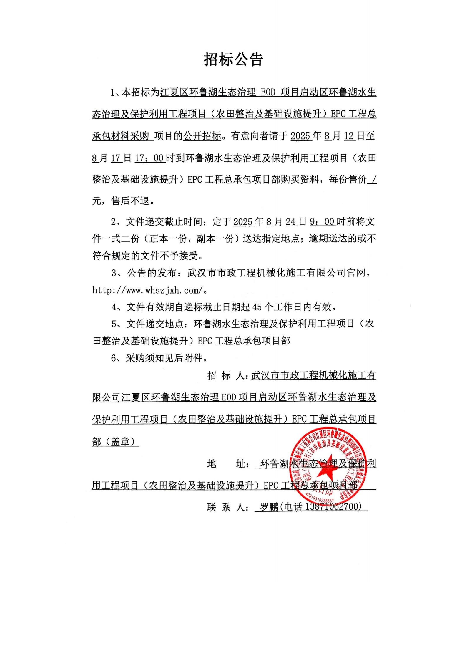 江夏區(qū)環(huán)魯湖生態(tài)治理 E0D 項(xiàng)目啟動(dòng)區(qū)環(huán)魯湖水生態(tài)治理及保護(hù)利用工程項(xiàng)目(農(nóng)田整治及基礎(chǔ)設(shè)施提升)EPC工程總承包材料采購(gòu)招標(biāo)公告
