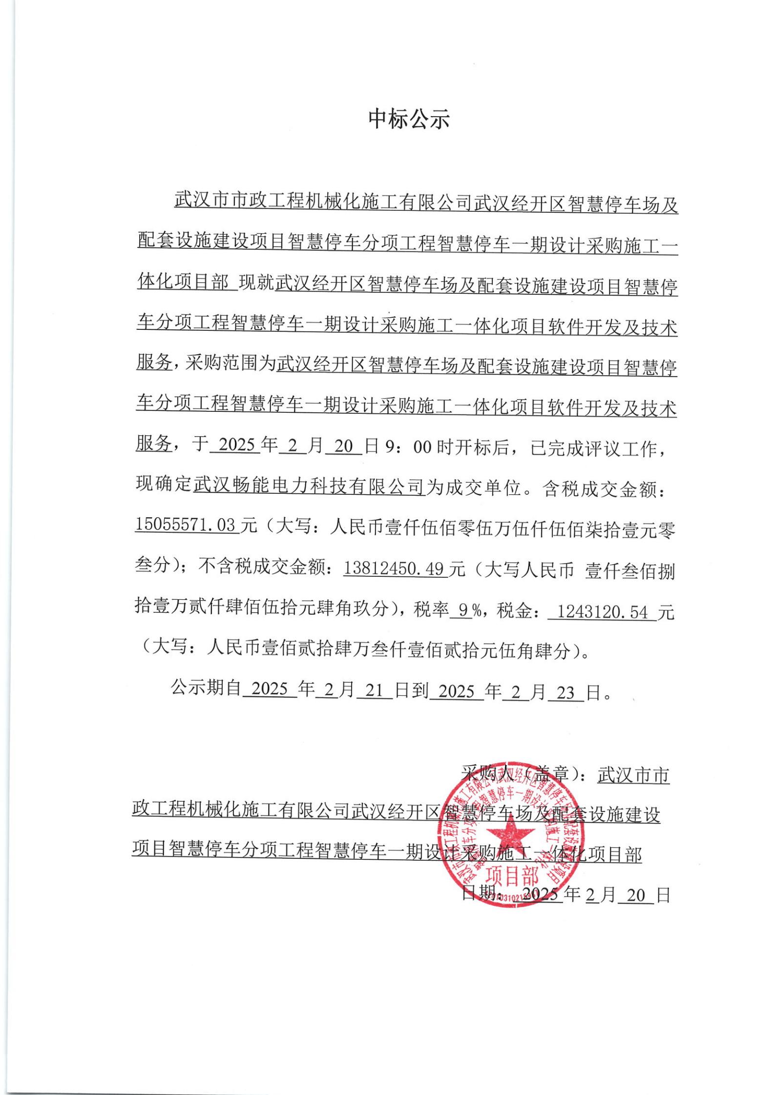 武漢經(jīng)開(kāi)區(qū)智慧停車(chē)場(chǎng)及配套設(shè)施建設(shè)項(xiàng)目智慧停車(chē)分項(xiàng)工程智慧停車(chē)一期設(shè)計(jì)采購(gòu)施工一體化項(xiàng)目工程軟件開(kāi)發(fā)及技術(shù)服務(wù)中標(biāo)公示