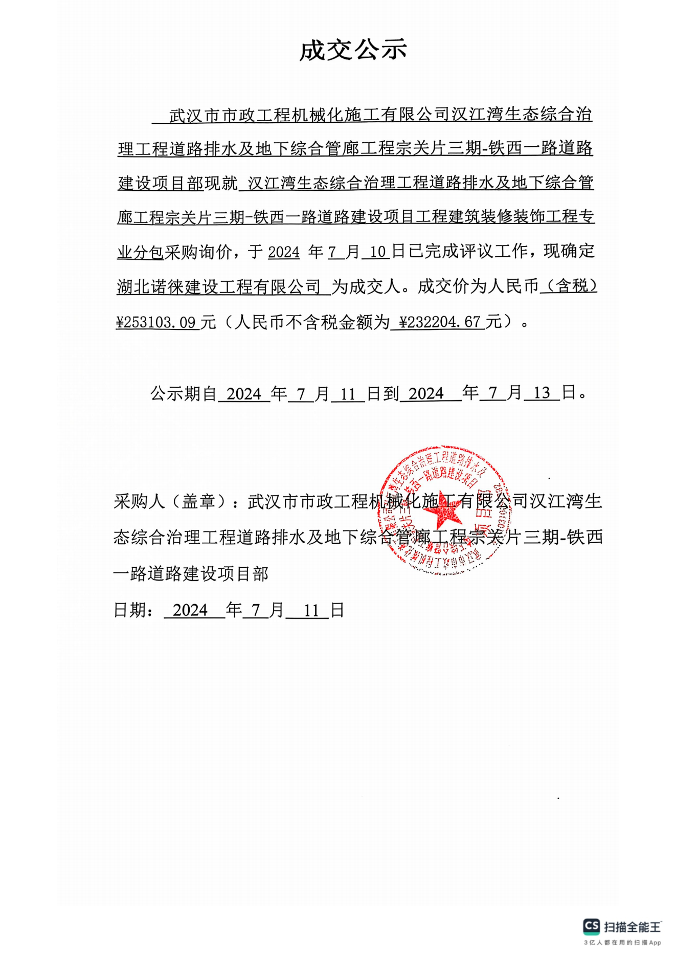 漢江灣生態(tài)綜合治理工程道路排水及地下綜合管廊工程宗關(guān)片三期-鐵西一路道路建設(shè)項(xiàng)目工程建筑裝修裝飾工程專業(yè)分包詢價(jià)成交公示