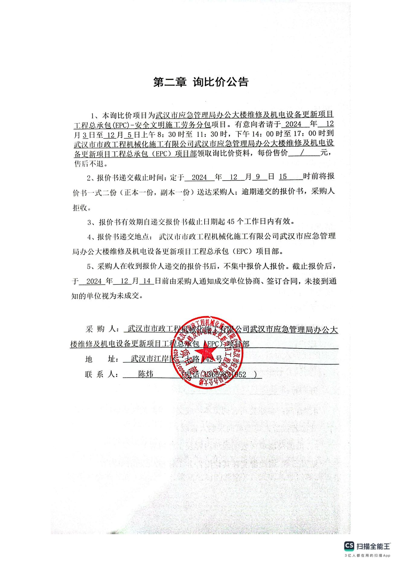 武漢市應(yīng)急管理局辦公大樓維修及機(jī)電設(shè)備更新項(xiàng)目工程總承包(EPC)-安全文明施工勞務(wù)分包詢價(jià)公告
