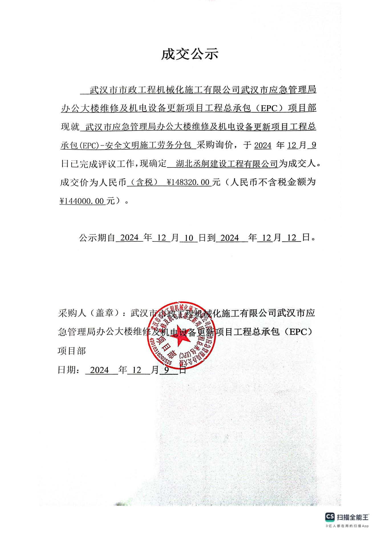 武漢市應(yīng)急管理局辦公大樓維修及機(jī)電設(shè)備更新項(xiàng)目工程總承包(EPC)-安全文明施工勞務(wù)分包成交公示