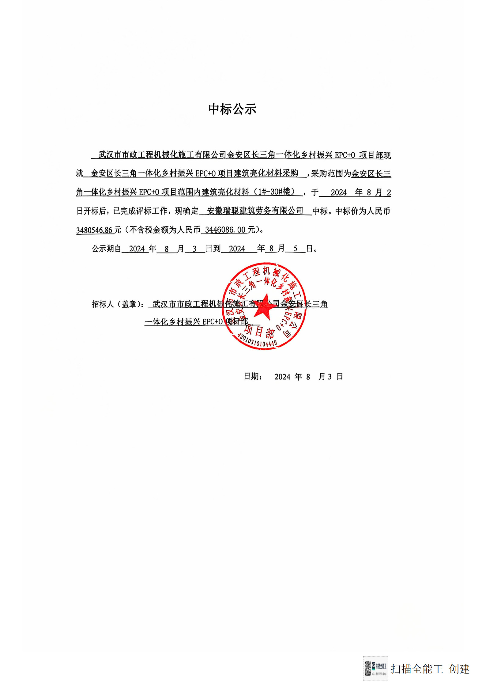 金安區(qū)長(zhǎng)三角一體化鄉(xiāng)村振興EPC+O項(xiàng)目建筑亮化材料采購(gòu)中標(biāo)公示