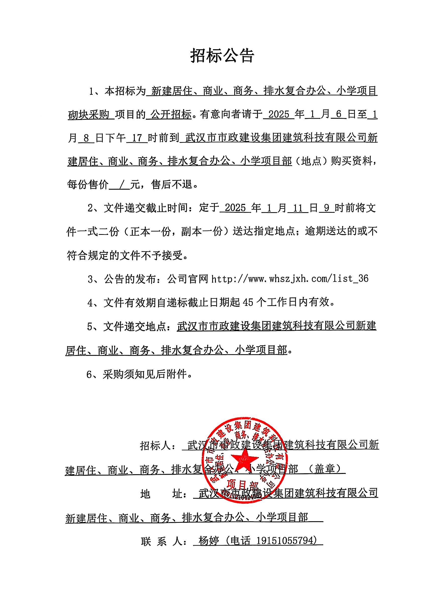 武漢市市政建設(shè)集團建筑科技有限公司新建居住、商業(yè)、商務(wù)、排水復(fù)合辦公、小學(xué)項目砌塊采購招標(biāo)公告