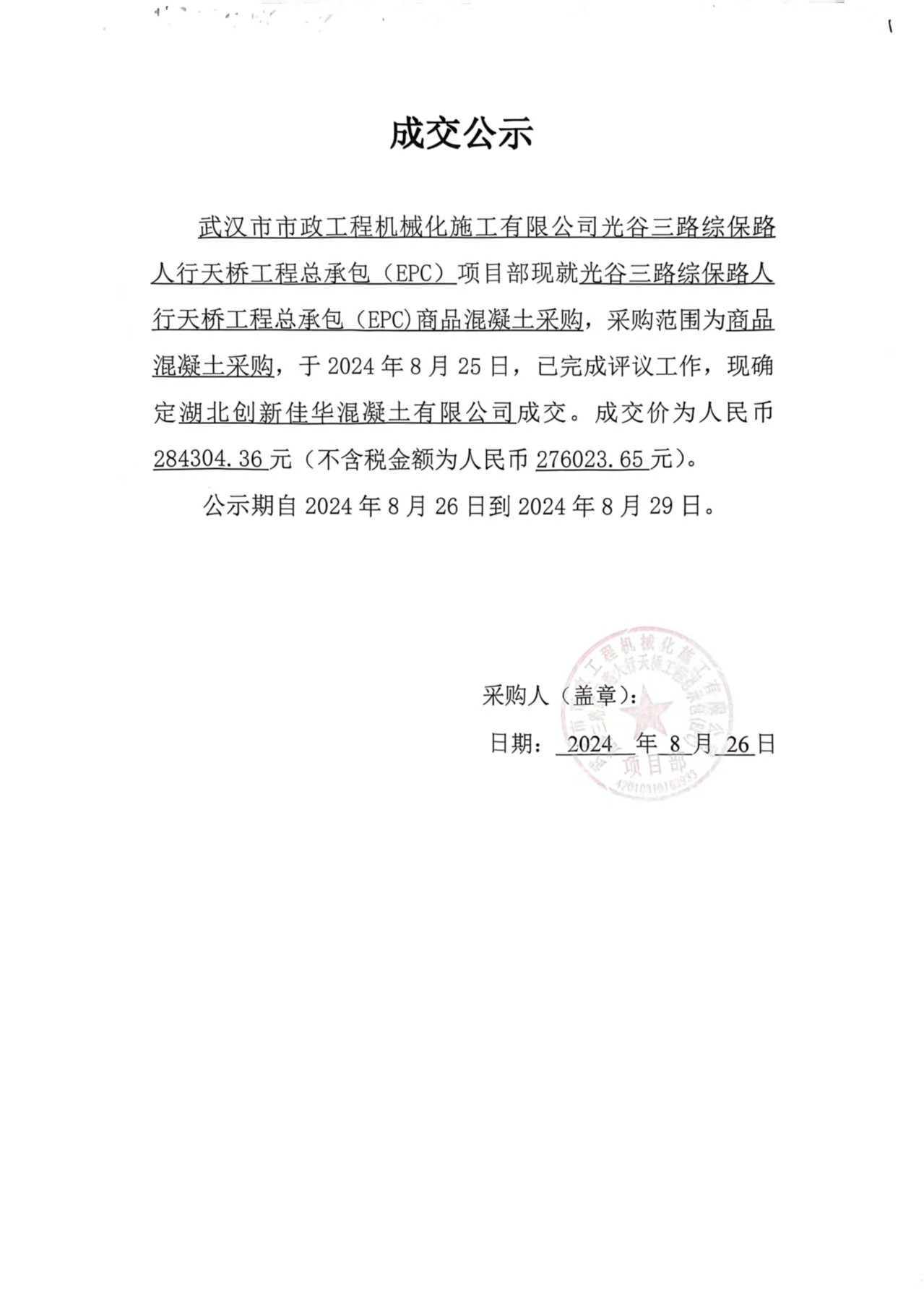 光谷三路綜保路人行天橋工程總承包(EPC)商品混凝土采購成交公示