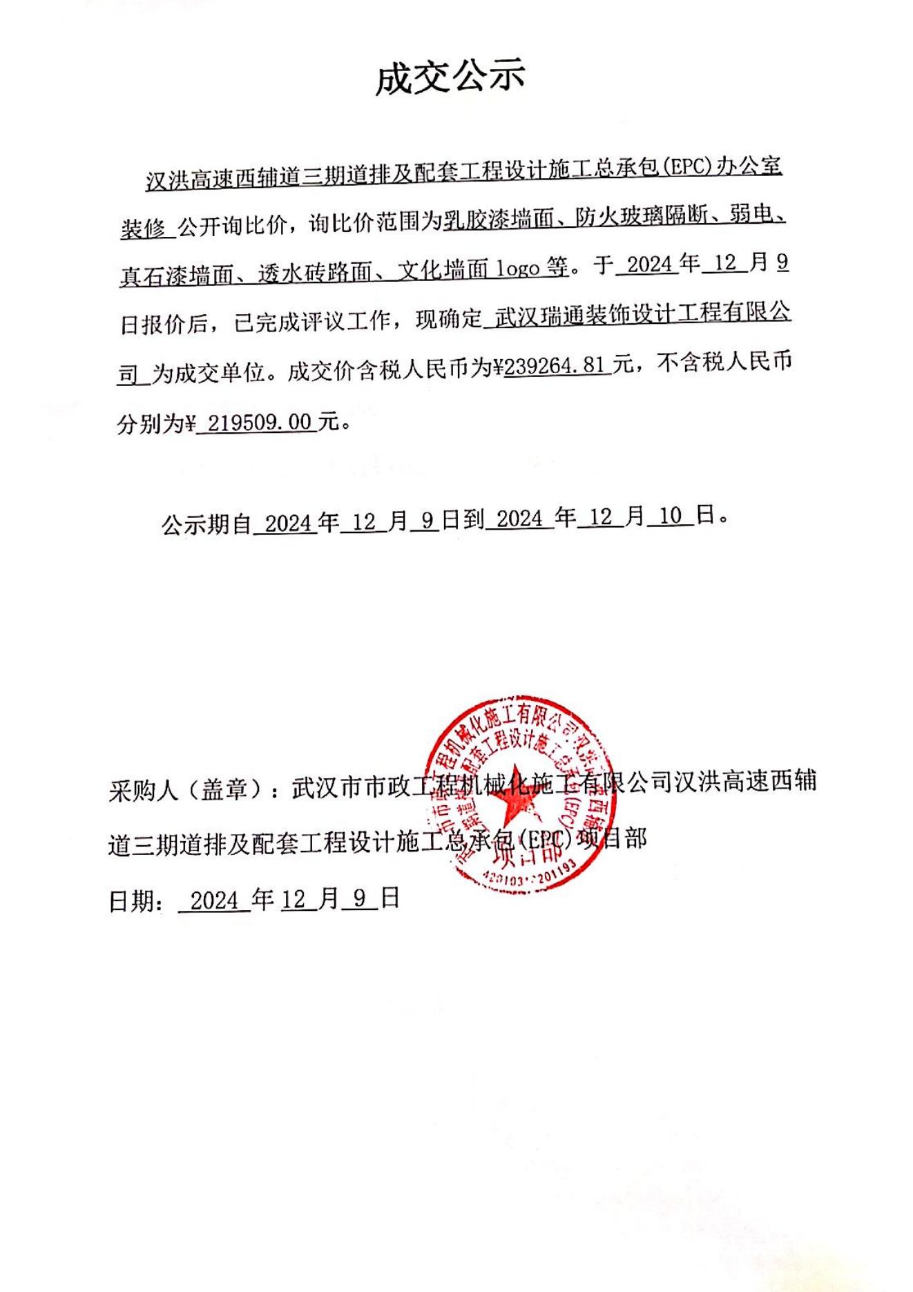 漢洪高速西輔道三期道排及配套工程設(shè)計(jì)施工總承包(EPC)辦公室裝修成交公示