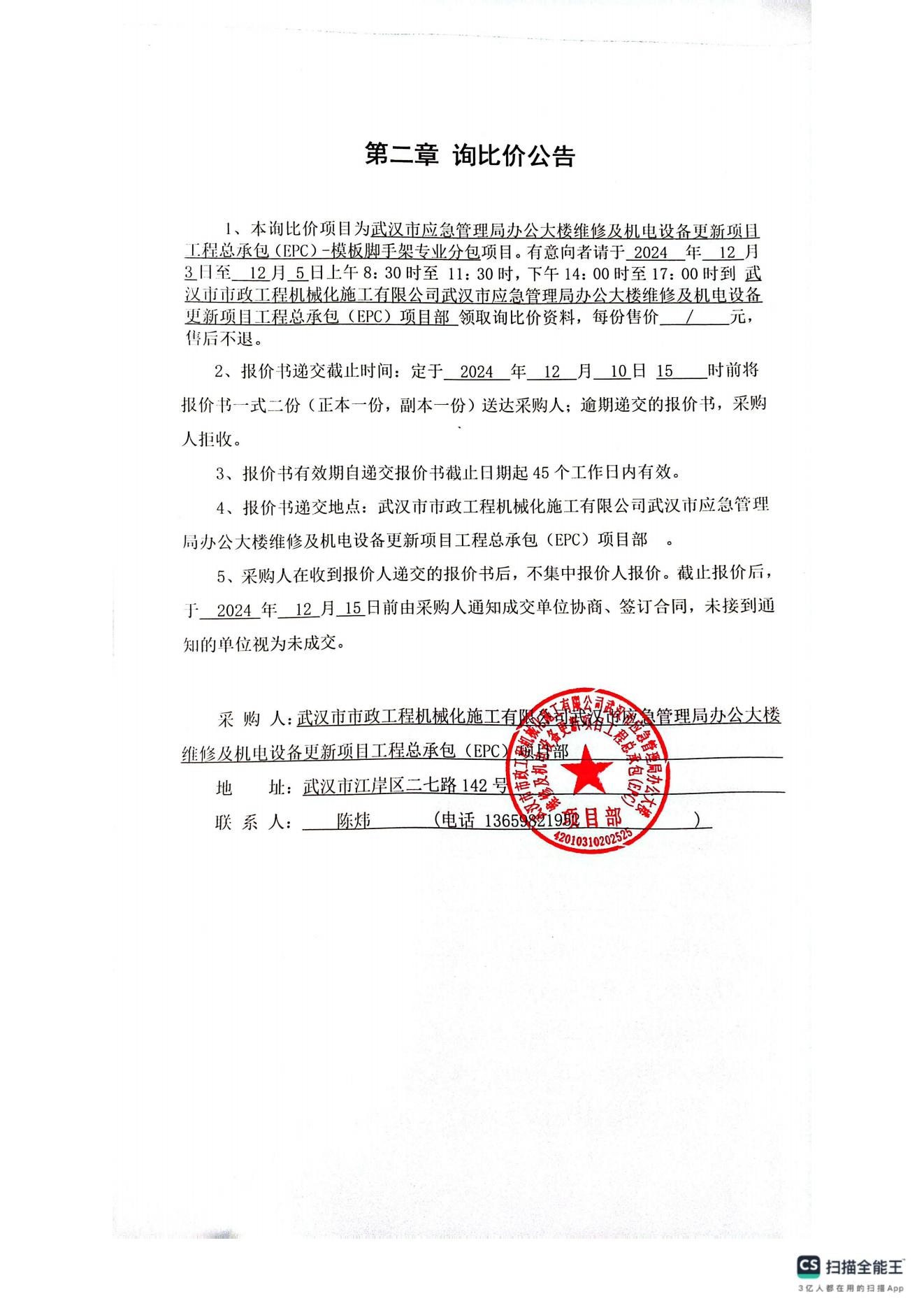 武漢市應(yīng)急管理局辦公大樓維修及機電設(shè)備更新項目工程總承包(EPC) -模板腳手架專業(yè)分包詢價公告